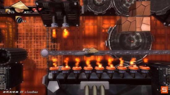 被这里的火焰打到楼下好几次,跳上去后要蹲下来,然后再往上跳。