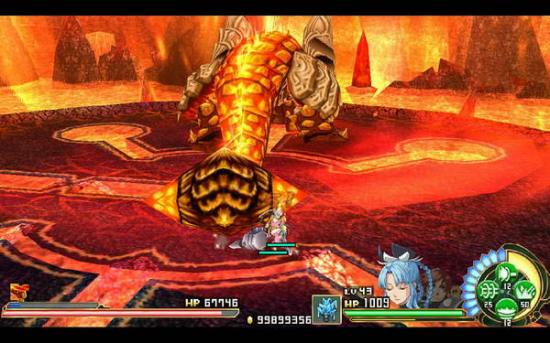 来到下处的炎之灵地深渊区,此时出现一个巨大的熔岩怪。一行人赶快沿着平台一路向上冲到最后的BOSS作战区域