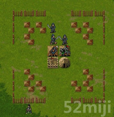 第五会合,尹赏右移一格到营门口右边放火烧弓箭兵,姜维往上走一格走到兵营中砍死另一个兵营的弓箭兵,