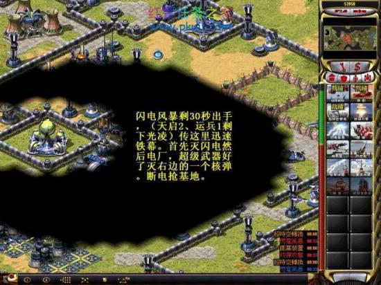 速度是关键,海豹炸船厂后占住建造位。幻影守路口,海里按图上的左边章鱼右边无谓和潜艇等(其实无畏强制攻击集结点出来就被轰掉了,好久没用记不清具体位置了)超级武器传送光凌+2天启+1运兵车罩铁幕过去。注意传送点和时间,等闪电剩30秒在传过去先打闪电在打核电。注意自己的超级武器造好马上集中轰另一边的核电让它断电后占领基地。家里造兵营出飞行兵,刚才的部队用路径功能清一边建筑飞行兵杀另一边建筑,小心飞艇清完过关。