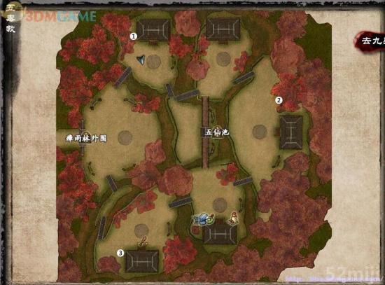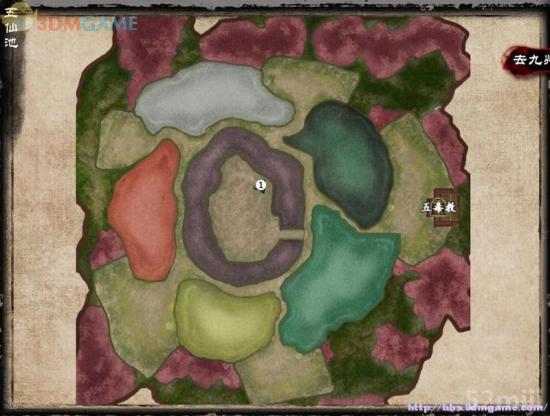在五仙池里分为六块区域,周围的五块区域分别有蟾蜍、蜘蛛、蜈蚣、蝎子、蛇五种石像,将石像旋转到相邻的池子方向会跳出对应的10只毒怪来,分两批登场,每次5只。最强的小怪当属蟾蜍,血多肉厚。战斗期间不能存档。