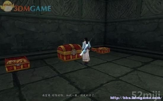 打倒机甲王,到后面的房间里拿宝箱。宝箱共有三只,正中的大宝箱里放的是任务道具-三把名剑。右边的宝箱里放的地图,收集完毕离开房间,主角自动被传送回华北官道。接下来赶往百药门,去见大哥南宫余。
