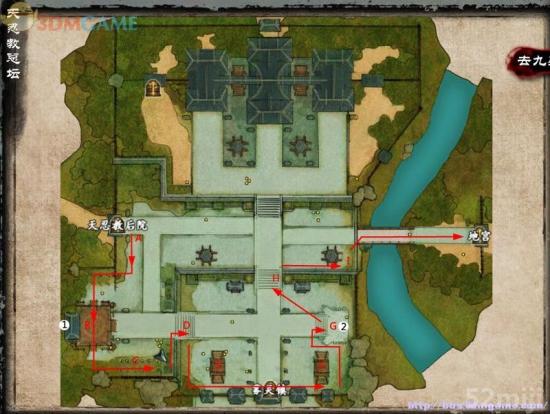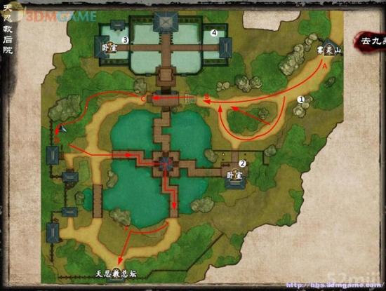 第一步:由于广场上的守卫众多,不能直接穿越过去,所以走迂回路线。由后院门口往南走,由擂台B穿过去,再往东穿过靶场C。