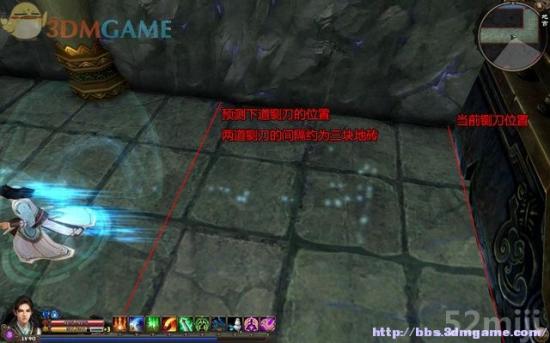 C旋转巨刃的房间,在这里把冰甲兽引出来消灭掉。跳过巨刃进到右侧的D铡刀走廊,这里的走廊有铡刀机关,每三块地砖的距离有一道,半块砖的位置是铡刀落点,后退两步,用冲刺技能“罗喉突”冲过去,这里可以无伤通过。