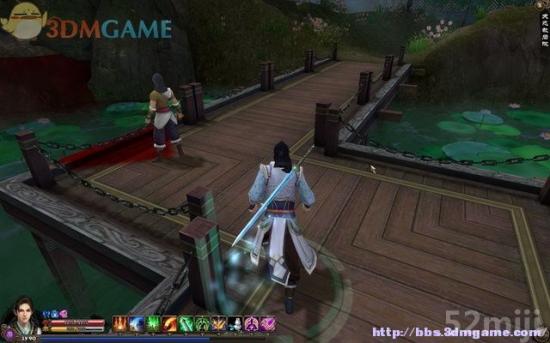第三步:观察前面有两座桥,相对的,笔者认为湖中心的桥比较好过些。趁东边桥面的守卫走出来,背对桥的时候,由他身后溜上桥去。