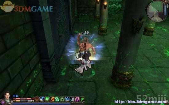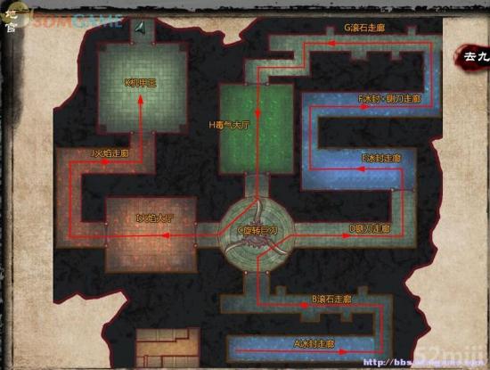 E冰封走廊有双排的喷吐寒气的龙头,并且方向不一致,在其中行进很容易被冻结,更何况中间还有八只冰甲人。这里要将冰甲人引到两端来打,在龙头机关的区域要快速通过,不能恋战,否则只有死路一条。