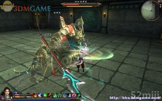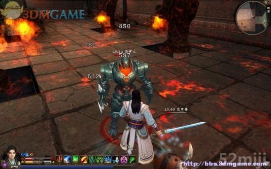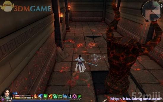 进到I火焰大厅,这里有六名炎甲人和两只炎甲兽,还有多个旋转喷射火焰的牛头,被火焰烧到会掉999点血量。在门口先将最临近的两名炎甲人引到门外杀掉。进到大厅,将中间的炎甲人引到墙边杀掉。最后再冲到大厅的对面,将余下的解决。