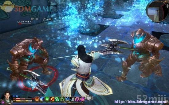 A冰封走廊会出现喷冰的龙头机关,被冰吹中就会冻结,同时还有全副铜甲的冰甲人缠斗不休,这里要绕着过龙头,不与这些冰甲人纠缠,到走廊的末端再清掉他们。