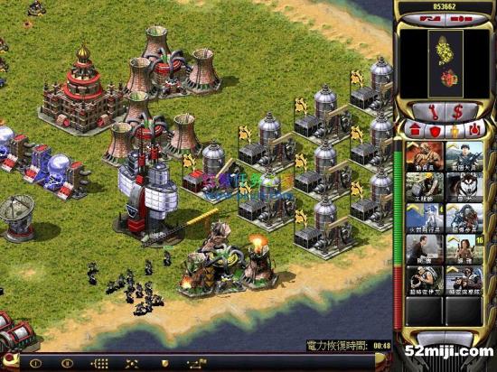间谍断电。超时空突击队炸掉敌军两个建造厂。(注意周围的敌军坦克之类的。多派些去。一个建造厂有围墙。突击队牺牲炸了旁边的核电站让围墙消失。然后再炸建造厂。其实也能用飞行兵,个人觉得飞行兵还是好些。不过我玩过一次。为了给自己加些乐趣所以才用的超时空突击队)然后就是不断使敌人断电的同时进攻,优先摧毁核电站,消灭全岛敌军建筑后别忘记了自家还有一个敌军的核电站。