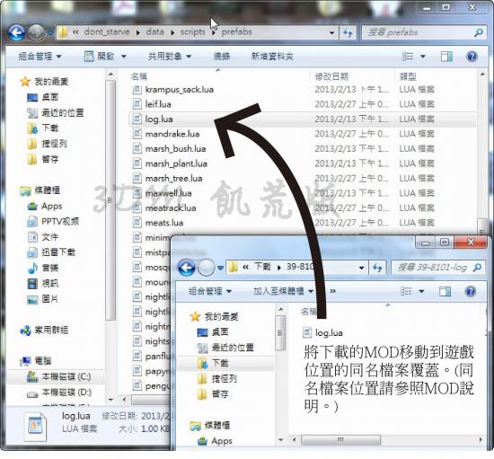(有些MOD内含多个lua档案,需要覆盖的档案地址也不同,移动档案时须多加注意。)