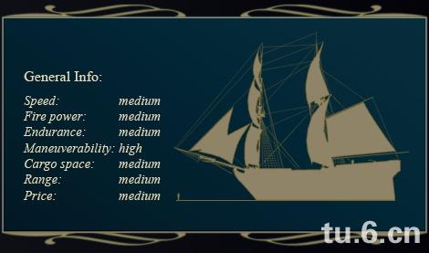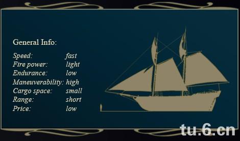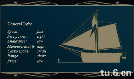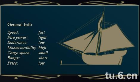 由于帆的数量和船身大小的关系,商用单桅纵帆船的速度非常快,但由于他们较小的体积限制了他们不能携带大量的货物。所以它们经常被用来运送想黄金珠宝这样的小件的贵重物品。因为只有仅仅10门左右的加农炮,商用单桅纵帆船在游戏中的防御性比较差,所以应该避免和强大的船只对抗。正常情况下,单桅纵帆船应当利用他们机动灵活的特点快速的从敌人大型船只附近逃脱。由于其低廉的价格,它是玩家开局时很好的选择。