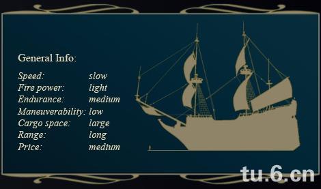 Flute, also known as Fluyt, is transport ship originating from the Netherlands. Dutch East India Company uses flutes in large numbers, but other nations have adopted it too. It is very seaworthy vessel, easily capable of enduring the long voyages on high seas. Flute has medium cannons, but it is no match for warships and should avoid combat.