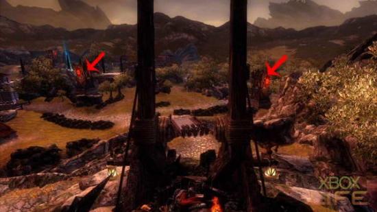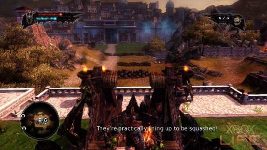 投石机准备就绪后,玩家可以先把地面上的军队先解决掉,紧接著再把二座弓箭塔砸掉。如果没有把弓箭塔砸掉的话,只要玩家经过它的发射范围时,它们会毫不客气地向魔王发射火箭,让魔王被秒杀。