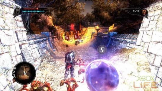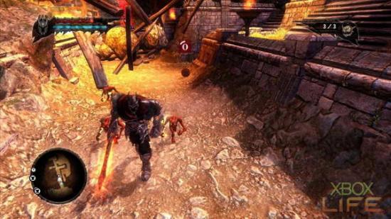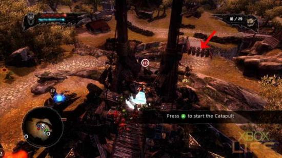 到达城市大门前广场处,会触发一段剧情动画,游戏控制权回到玩家手上后,命令小鬼把魔法球放在投石机旁的开关上,投石机便会从地底钻出!
