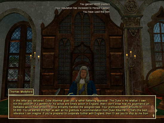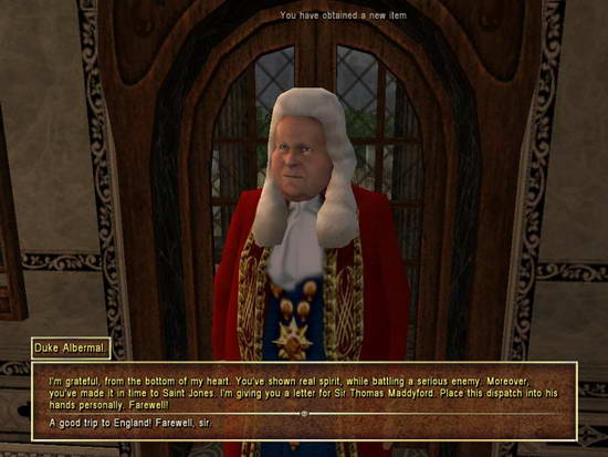 战斗结束后进入总督府,公爵Duke Albermal交代情况,表扬你出色完成任务并交给你一封回信转交给托马斯总督。