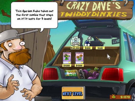到后来会在某一个关卡结束时取得 Crazy Dave 的后车箱钥匙,此时就可以购买更多种的道具了,像是豌豆机关枪或是九格种子箱等等。