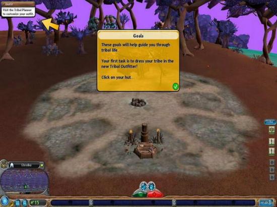 左上角的任务目标将会指引你完成部落生活。首先要到部落装备界面去为你的部落成员选择一身合适的服饰。首先要点击棚屋。