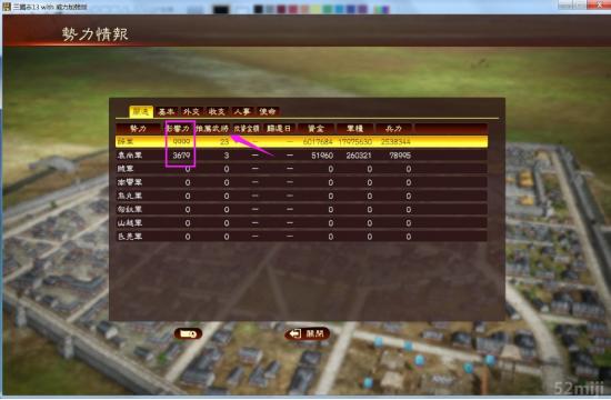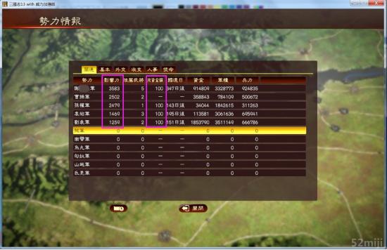 有了这些影响力,你就可以让你中意的势力发展了。这里我要说说,到底是白龙好?还是黑龙好???如果你从全局来看,肯定是白龙好。白龙可以推荐武将,黑龙不可以。白龙可以促成同盟和停战,请求攻打城市;黑龙可以流放指定武将。我是帮左边的谢军的,所以我就让3家同时打曹操。曹操消耗得差不多的时候,就让另外两家停战,让谢军打,赚了不少城市和武将。反正你想让谁打就打,按照你的想法就行。爽吧。 这是我后期的影响力。