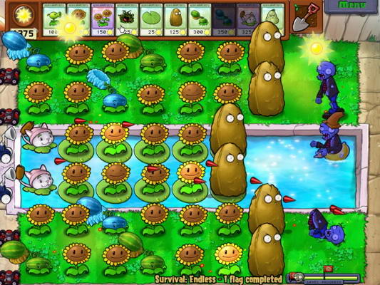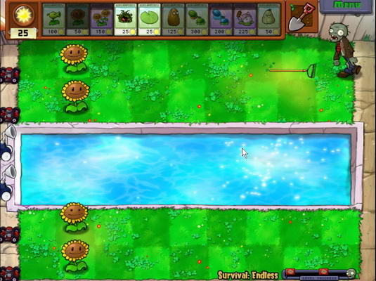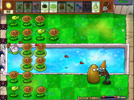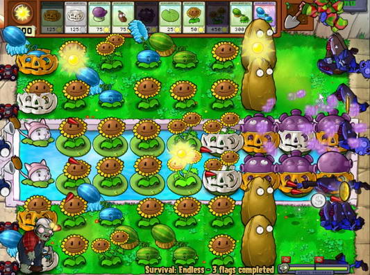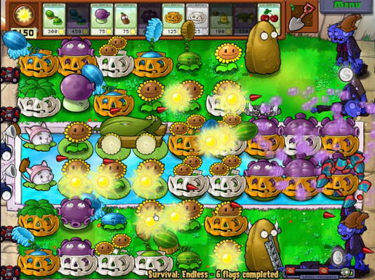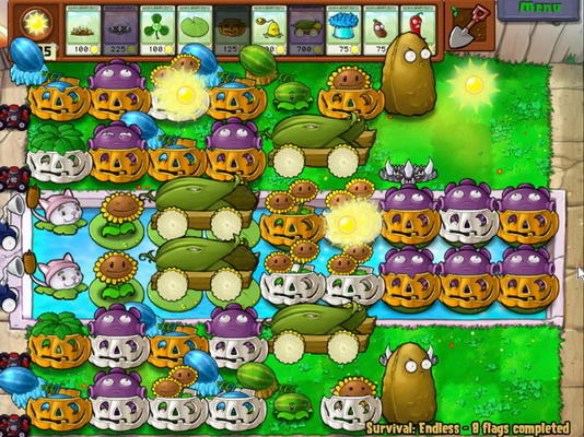 8炮流的威力不需要解释了吧,有人已经凭借8炮阵型打到生存200+了。在这里主要是向新手演示一下初期阵型的发展。基本的思路是前期尽量种花,尽可能不要造多余的植物 。你不一定要像这样发展,但至少应该在15关以前成型。这次我在第9关成型,算是比较快了。但即使稍慢,用这种方法12关时也应该可以成型了。