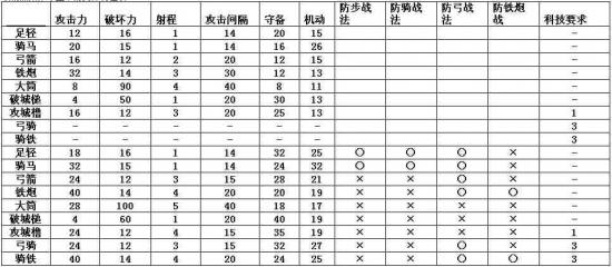 从兵种属性列表中我们可以看到本作大筒被大大地加强了,似乎要变成攻城的主力。但是科技已经注定大筒无法量产,所以用起来也需要格外小心,没有种足够的田恐怕是养不起大筒军的。
