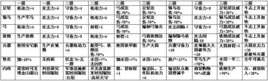 从上面的表格大家可以看到,科技基本上是为军备服务的。内政及其他类的科技只占了不到三分之一。那么正好从科技分析一下本作的兵种。以下便是从科技列表的加成推导出来的兵种属性表。