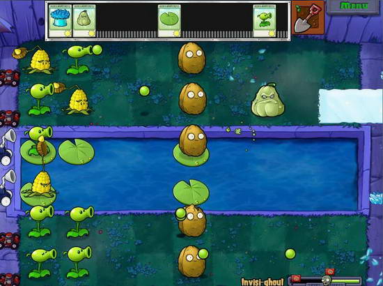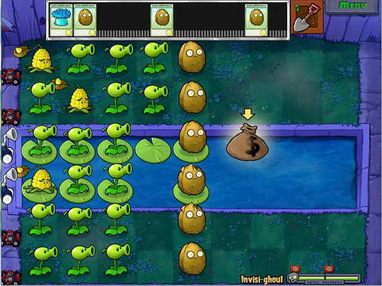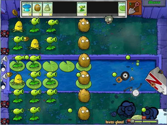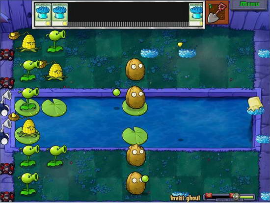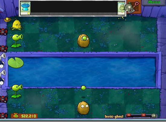 首先是开局,刚开始植物都很有限,因此,要利用有限的豌豆、玉米和墙果将四条陆路封死,不能留有死角。