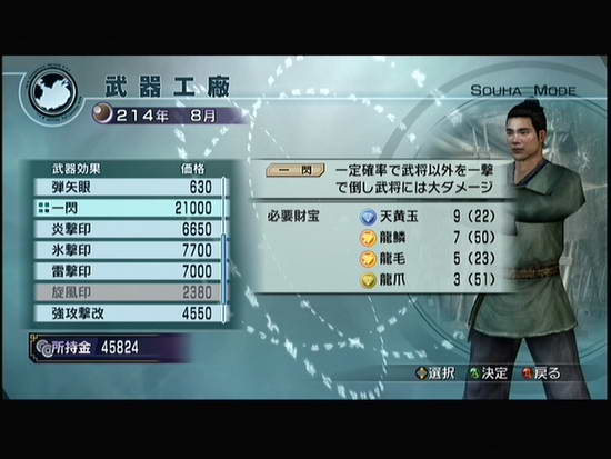 | 一闪 | 一定几率秒杀杂兵,给予武将较大伤害 | 30000 | 天黄玉:9 龙鳞:7 龙毛:5 龙爪:3 |