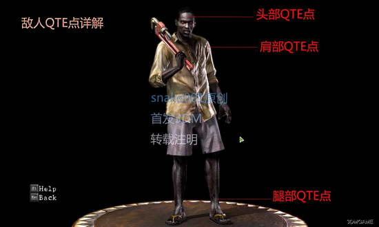 QTE是Quick Timer Events(快速反应按键)的缩写。QTE广泛运用于电子、电脑游戏中,尤其是动作类游戏。当满足一定条件时,就会触发QTE事件。生化5中QTE即是你在游戏中使用武器击中敌人弱点,出现敌人僵直你靠近使用按键触发体术时的画面,下图是一般敌人QTE点。