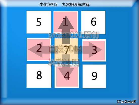 了解了九宫格,就来了解下快速装弹,所谓快速装弹就是在对敌人QTE中,爬楼梯中,按下Y键(即九宫格菜单,个人是使用360手柄玩pc版的,所以以360手柄为准,键盘玩家请自己参看按键设置)出现以上的半透明菜单,默认光标定于7中,个人建议将武器分布于1,2,3,4格,常用子弹放于7,在QTE时间中玩家无敌,且有短暂的时间,在这时,快速按X键将7的子弹移到要装填的武器上(即箭头方向,依你使用的弹药与武器而定)就是快速上弹,完全不用理会平常情况下RT+A的上弹模式,这在实战中是必须熟练掌握的技巧。