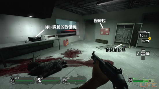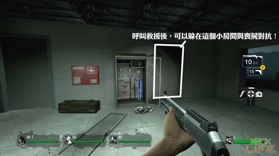 等待救援对抗点一:如果觉得心脏无力无法正面与丧尸对决的话,这个房间可是非常好的点,因为房间里是封死的,玩家只要顾著那道门就可以了。