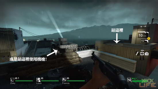 救援对抗点二:这个打法是比较适合与好友合作的打法,一方人站在右边另一方人站在机枪点扫射。这样的方法可以分散丧尸群,还可以作到互相掩护的有利位置,但是值得注意的是,如果一方被“猎人”或“长舌公”抓到的话没有立即处理,很容易就会“灭团”的喔。