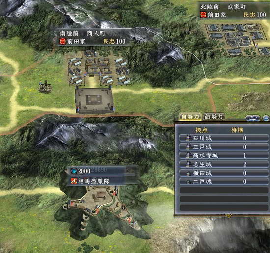 55上级难度玩的大岐家上来3个废材,只有个一栗还是弓兵,我自己编了个庆次进去,叫大奇废材隐退了哈哈.本人种田加蚕食流,爆兵打下斯波高水寺城,在三户城下筑了二户城.大军都堆在北方活活和南部火拼了N久,伊达废物和我市同盟本来不怕后院起火.结果伊达居然打不过相马,西山城被相马拿了屯了35000兵,我的老本名声城只有3000兵力,妈的难道要悲剧了啊.....