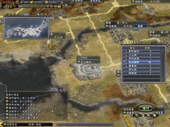 进行按钮下面还有四个小按钮,假如不小心把上述的三个信息栏关闭了,可以选择第一个信息栏按钮重新进行设置;第二个信息按钮用来查看游戏的各项数据的;第三个按钮选择鸟瞰界面,鸟瞰视角看到的范围更加广,但不可在进行中查看,玩过文明4的玩家对这个视角肯定有印象。第四个是功能按钮,可以进行存档、读档、完全委托电脑进行游戏,进入初始界面,还可以查看用语词典等诸多功能。