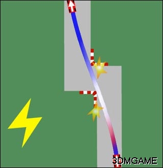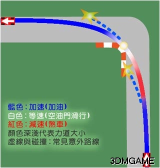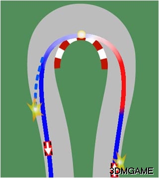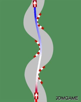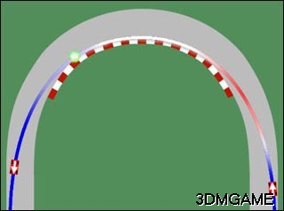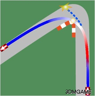 不难看出,正确且最佳的进、出弯路线都有一个共同的特点,那就是它们都必然接触到"路腰",这就是为什么电视转播里的赛况,赛车总是"摸"着"路腰"过弯的原因~ 当你在游戏中正确套用这些正确且最佳路线时,你必须通过确认自己是否也同样"摸"着"路腰"过弯,通过这个现象来判定自己的过弯路线是否正确,若不正确,就要在下一圈中加以改正,这样不断去习惯并且训练自己,过弯时你才会有丰富的经验去判断下一个弯应该用什么方式去过,才能很快的去分析并找出正确的行车路线! 记住! 这也是一个赛手必须具备的基本知识!在这里给大家提一个小窍门:仔细看游戏中的赛道,你不难发现,每条赛道的弯口前后都会有一些刹车印记,当你看到印记渐渐清晰时,代表这里开始你就要减速了~ 进入弯道时,你可以顺着弯道路面上的印记开,这样的路线就是正确的路线,当然,等你成为一个高手之后,你就不必再看着这些大众路线去照着走了~你完全可以寻找更适合自己并且更好更捷径的路线~ 只要不提示犯规,我可以告诉你,那它就是最好的捷径路线!