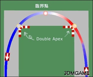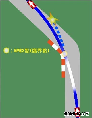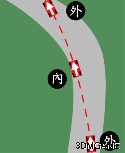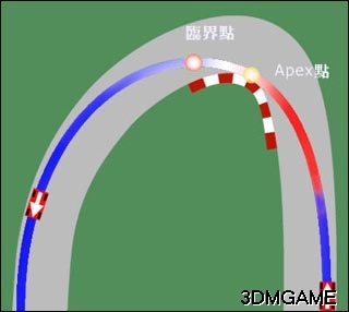 图组中大部分的进弯是以一种被称为"外-内-外"的方式来表示出来的,所谓的外内外,指的是车子通过弯道的路线,从接近弯道到进入弯道再到出弯的所走的那条线~ 路线中最接近弯心的那一点称为"APEX"点,通常"外-内-外"的"APEX"点刚好会是中间那一点,除了一些不用煞车减速就能通过的弯道外,APEX点通常也会是动力上的临界点(critical point)~ 以临界点作为分界,在这之前属于减速入弯的阶段,临界点之后就属于加速出弯的部份~ (事实上我还找不到专有名词形容入弯后开始加速出弯的那个点,这里暂时先以临界点称呼)~ 有人会质疑,采用科学上的计算,连接两点之间最短距离的应该就是最接近直线的线(当然能直线是最好),因此若拿通过发夹弯的路线来讲,最短的线应该是"内-内-内",而不是“外-内-外”,单纯以距离而言,"内-内-内"的确是最短的线没错,那为什么赛车却要走"外-内-外"呢~?"内-内-内"确实是最短的线,但实际上赛车通过弯道最先考虑的是"能最快通过弯道的线",至于是不是最短的线倒并非绝对因素,赛车首重是时间,而不是距离,数学上"内-内-内"是最短没错,但在实际上,行走"内-内-内"的路线会使得赛车进出弯的速度落差极大,为了要在这么小的回转半径通过弯道,车速势必要降很多,对于出弯的加速极为不利,反而"外-内-外"虽非最短路线,但它却能提供赛车以比较高的速度过弯,两者相较之下,反而是外内外以比较短的时间通过弯道,而 "时间"正是决定比赛胜负的因素!以过弯而言,赛车追求的不只是最快速的通过弯道,还有最快的出弯速度,倘若只是比别人更快进弯,但出弯若是慢慢来还是会被对手赶过去,反之若有比对手更快的出弯速度,那即使是跟在对手后方,出弯后仍然可以超越他~!因此还有一种重视出弯速度的外外内取线~ 听来"外-外-内"似乎是有更快出弯速度与能突破"外-内-外"防御的优点,但凡事总是一体两面有好有坏,"外-外-内"还是有其隐忧,主要是在于进弯时偏外的路线~