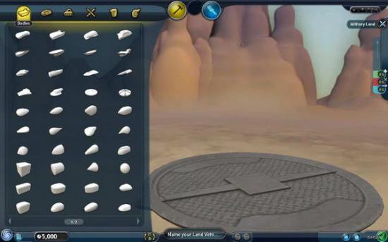 接下来就是建造一个属于自己的载具。最上面一栏从左到右依次是车身、驾仓、行动方式、武器、效果、细节装饰。其中前四项会使车辆的属性发生变化,具体的变化效果可见右上角的条形图,最上面绿色的是血量,中间的是车辆的攻击(外交、贸易)性能,最下面的是速度,一目了然。