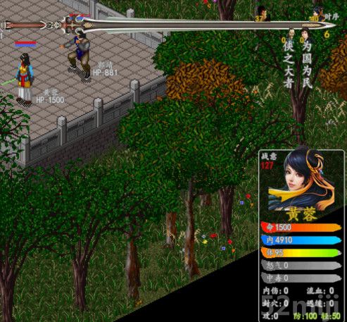图中郭靖黄蓉在场时,可见黄蓉头像下方绿色的防100,轻50的属性加成。左上角可以观测到战意。