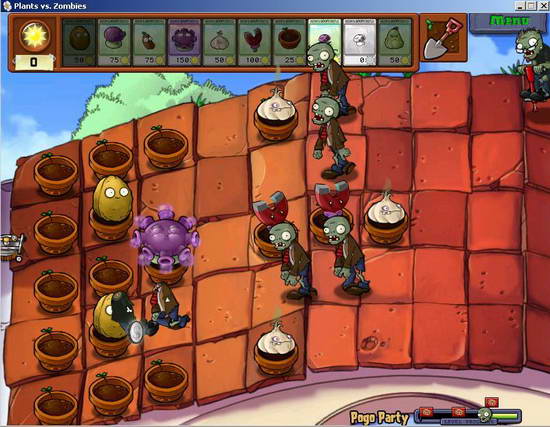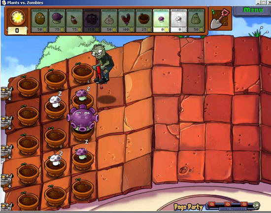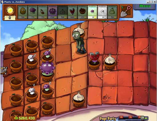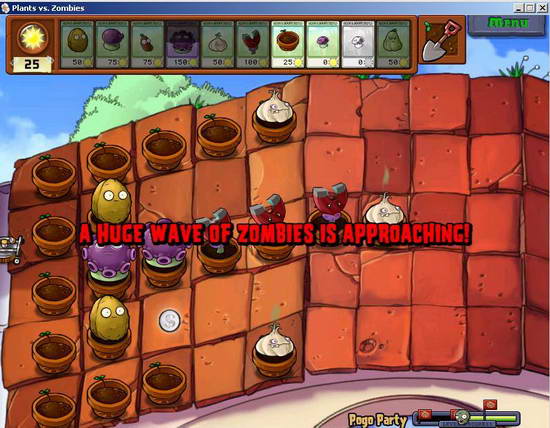 运气不好,这次的僵尸在己经损了车的第一路出现,阳光只够放一个咖啡豆和一个花盆,被迫用了两个小蘑菇顶到够阳光放大蒜..