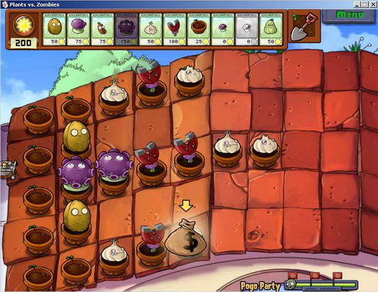 前4个僵尸肯定不会是同一路的,4个车子是一定会损的..这时能捡到100阳光,随时准备激活磁铁和在需要的路上放上花盆,蒜头。