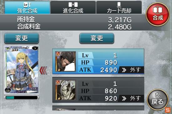 强化合成:左边是选择你要合成的卡片,右边是你合成的素材,当然素材的稀有等级越高,你合成的效果就越好……目前lz没钱只能用最普通的素材卡来强化。