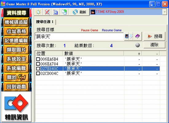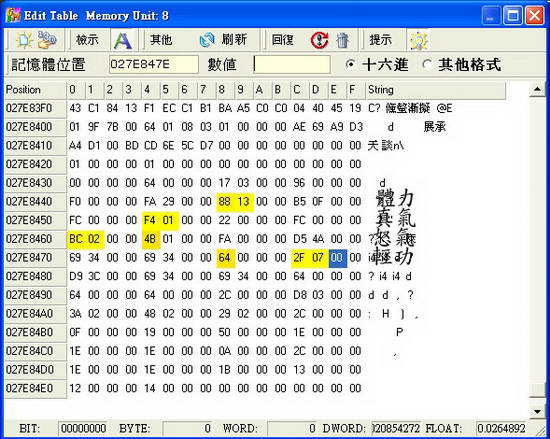 再加一个金钱修改的方法,如果金钱是7500的话,那么十六进位数值为1D4C,反过来为4C 1D, 再将4C 转为十进位时为76, 再将255-76=179,再将1D转成十进位是29, 所以在用GM8搜寻时就变成 179,29,00,00.这样一来就应该能找到了