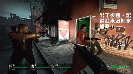来到后巷,图示的门会有“随机”的机率拿到止痛药或是燃烧弹。另外在走出后巷前会看到二台车子,车子上面也会有小手枪如果有出现的话,记得要拿取喔!(双枪很帅的耶!)