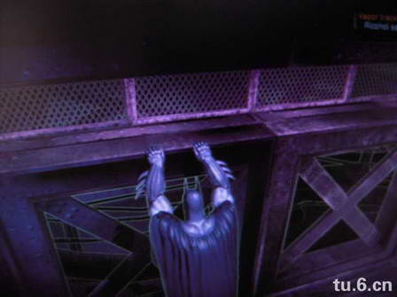 游戏中可以用RB跳上更高的地方,这里往前走就进入了任务区域,这里已经被小丑释放了大量毒气。我们只能在高层前进,如果掉下去的话就必须用钩锁脱身。这里也有很多挂在边缘的守卫,就起他们的话可以增加经验值,这里也有一个犯人需要救援,如果救了他的话会解锁成就