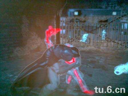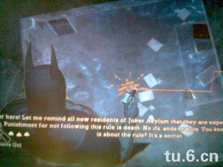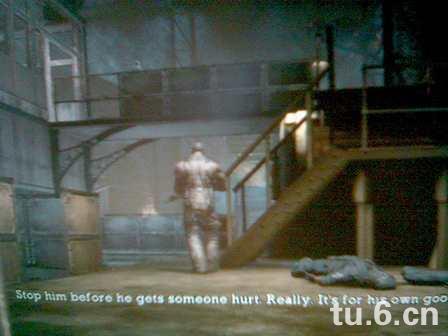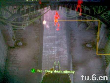 之后进门,看到前面围着一群武装起来的敌人,正面冲突也可以,但蝙蝠侠的拳头毕竟快不过子弹,所以还是按提示绕到他们后面,然后静悄悄的干晕他们。这一点疯人院又吸收了分裂细胞系列中的潜入与偷袭要素,玩起来更有感觉了,这也让我们更加认识到了蝙蝠侠智勇双全的另一面