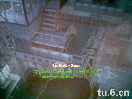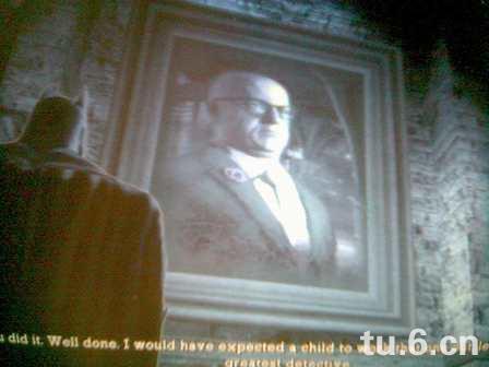 之后问号先生会在无线电里登场,他会告诉你整个阿卡汉姆岛上已经布满了他设置的谜题(也就是问号先生的挑战),谜题的解锁会对你的完成度产生影响。之后他会提示你在屋子里有寻找警长的线索,按提示在刚才我们发现'dead end'尸体的附近找到一幅画,在侦查模式里按LB就可以分析这幅画了。之后进入剧情