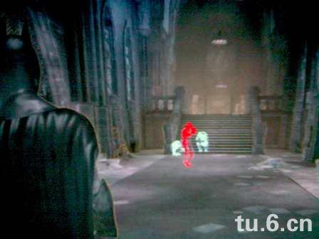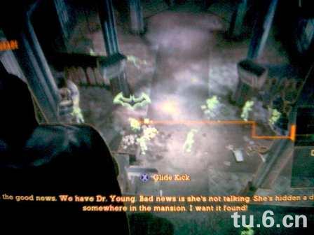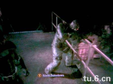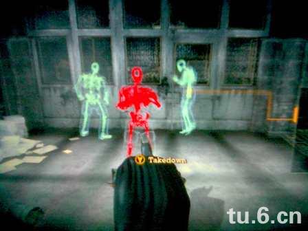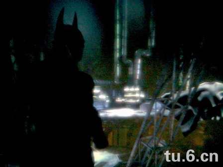 继续前进,遇到敌方挟持人质,这里地形很适合偷袭,还是慢慢享受偷袭的乐趣吧,如果你习得了从雕像上按B键垂下来偷袭的技能的话可以好好使用了。这里的敌人打晕后脖子上的装置会发出响声,不过对我们也没多大威胁,等他们开始四散开找你时再下手(这里再夸一下偷袭的制作,敌人对蝙蝠侠的反应被做的非常真实,一开始被偷袭掉一个人后其余的人会很聪明的两两一组,前后巡视,等到我们偷袭的人越来越多,敌方人员就越来越恐惧和多疑,只剩一个人时,那个人甚至会疯狂的开枪,到了歇斯底里的程度!)