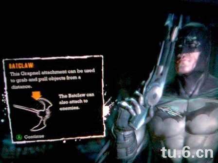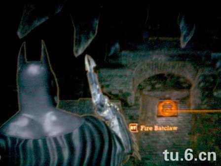 之后自动得到道具钩锁枪,可以用它把半空的机关,如管道栅栏等轻易拉下来。将左边对面的箱子拉下去后顺路走出蝙蝠洞