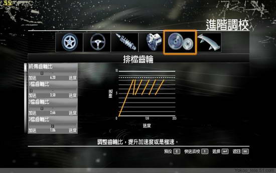 可是,我们这些业余选手,又想在极品13里找到速度与激情 又不愿意动不动乱撞的玩家怎么办?所以 极品13就给我们提供了精细的调校选项,说起这个来我也头疼,有些根本不知道代表什么,不过根据我的琢磨,我把基本的方法简单的说下