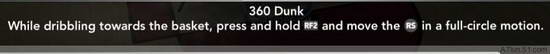 18.360度扣篮,加速带球进攻时,右摇杆环绕一周,示例(我怎么做不到360度转身扣篮?难道我的操作有问题?还是LBJ的问题? 难道指的是大风车?都不知道有没有错)