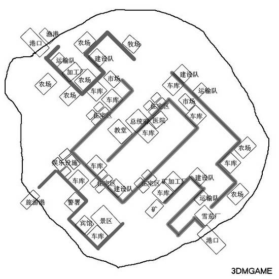 在岛上做一笔画,比如如果原来是“丰”字结构的设计,改成“弓”字结构。如果一笔无法完成(往往是因为岛太大,从这头到那头绕来绕去路线实在太长)需要两三笔的话,笔笔不要衔接,也就是公路之间没有任何连接,不连通,不相关。每条公路所负责的区域之间互相独立,没有物流往来。相当于一个个独立的小镇(以下称为区域,概念相当于大家说的住宅区,工业区,农业区什么的)。